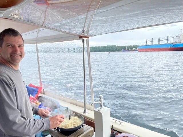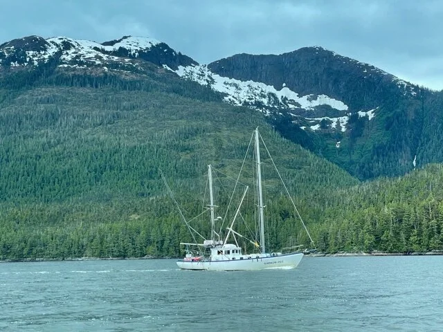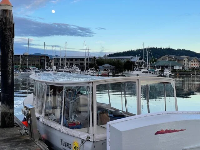 Alex and David arrived in Ketchikan late afternoon on Sunday, June 13! It took them 20 days after leaving Bellingham. In general the weather was cool, overcast and rainy with short breaks of sun now and then. They are happy to be here, and they’re enjoying using their legs to get around. I (Harriet) joined them Monday evening, and we will spend a few days exploring Ketchikan and Thorne Bay. Wayward Sun is docked, soaking up any sunlight, and ready to set forth again.