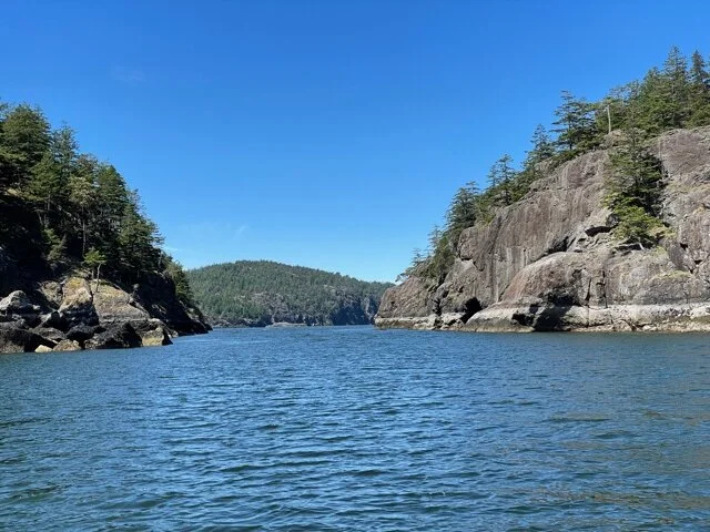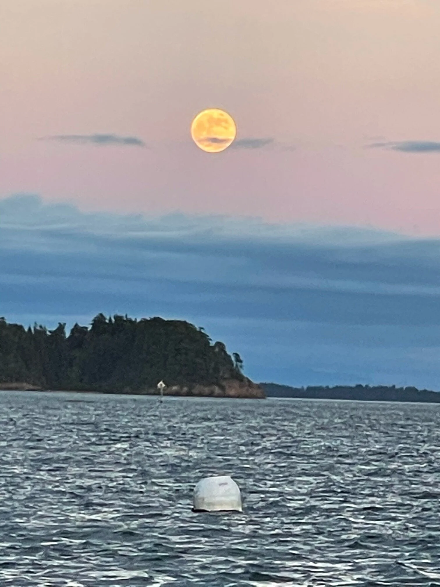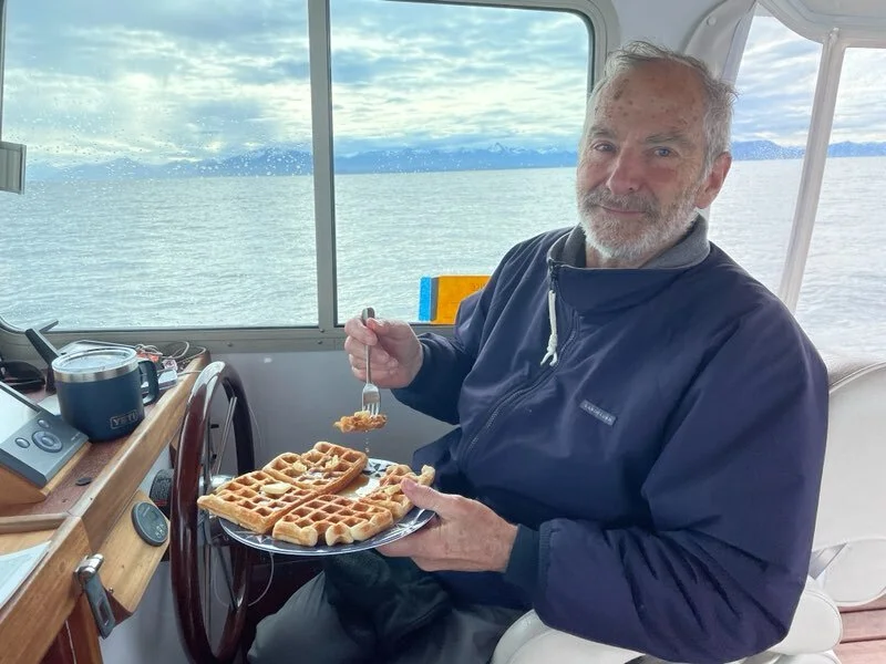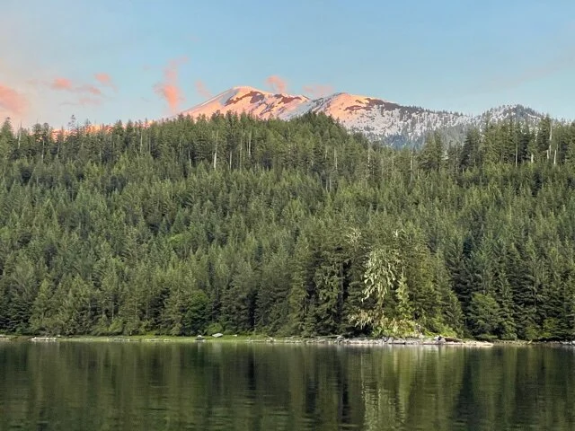 I’m writing this Sunday morning in Ham Island Bight, our night harbor with our local harbor seal. The sun was coming up at 4 when I had to get up, and the sea was up to the trees. Now it is on its way down 16 feet, then we’ll be off to Ketchikan. At breakfast we heard whale spouts on the other side of the tidal bar. We’ll be looking for cell service since our satellite hardware is not working.”