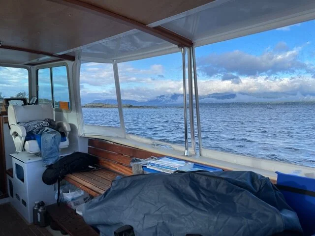 “At 6 am we started north from Klemtu in a heavy fog. At 7 we had our 10 o’clock (EDT) phone call about the electrical sytems for the fiberglass 24’ boats.