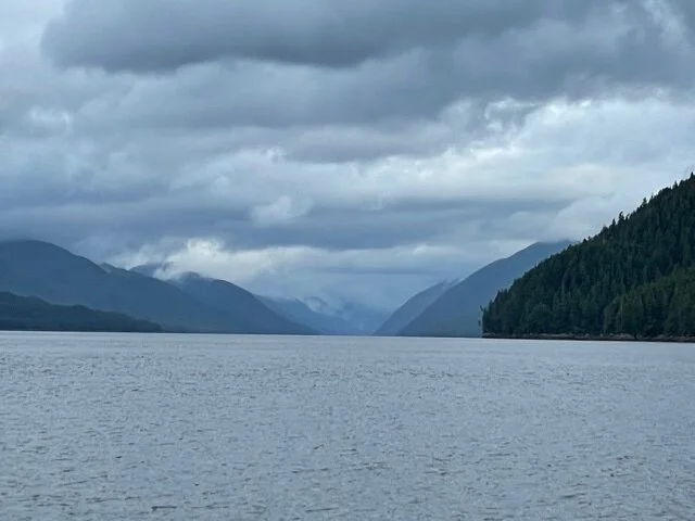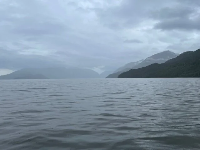 “Looking around we see snow-capped mountains, rocky shoulders and cliffs, evergreen forested slopes with waterfalls, some all the way from the melting snow right down to the water. Typical overcast day, typical overcast week.