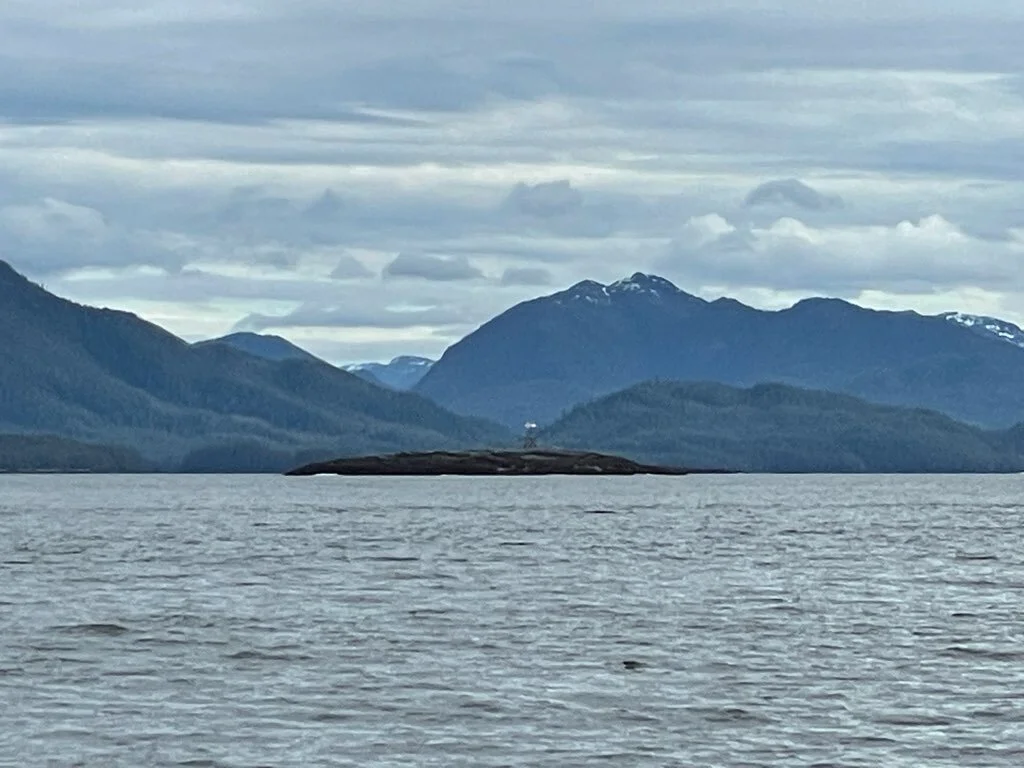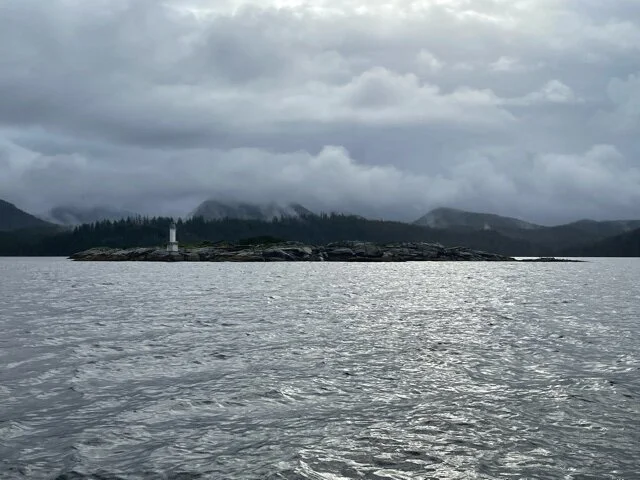 “Leaving our north-facing anchorage in Clam Cove (our last in BC), we could see Alaskan mountains over Dundas Island. In the channel we saw the Sir Wilfred Laurier, a Canadian ice breaker and research vessel. The Green Island lighthouse was ahead on the port side. Before 1906, when the light was built, that island was the site of major shipwrecks. One time after the light was working, its supply ship was late and it wrecked because oil for the lights had run out. We and the light are on the major shipping route to Alaska.