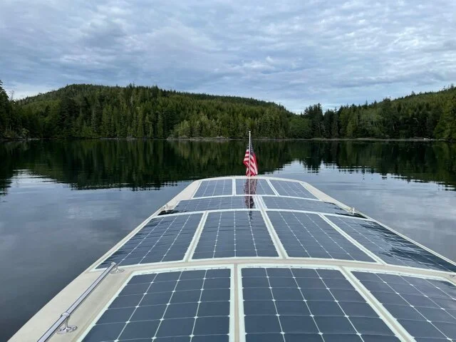 This morning they were off around 6:30 am in light rain to catch the 8:30 am slack tide for going through Seymour Narrows. There were about a dozen other boats with the same idea, as going through at any other time is hazardous for small boats. They went slowly to conserve battery power and made it through with no problems. As the rain slowed to a drizzle they were going 3 knots, getting ~650 watts from the sun, using ~200W for propulsion, and putting ~400W into the batteries. Pretty good to charge the batteries even in drizzle!